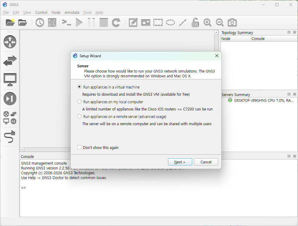 • 아래 그림과 같이 GNS3 Setup Wizard가 나온다. 첫번째 옵션을 유지하고, 아래쪽에 “Don’t show this again”을 체크하고 Next 클릭