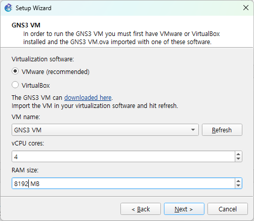 • GNS3 VM 설정 단계에서 학습자의 컴퓨터 환경과 실습 목적에 맞게 GNS3 VM에 할당할 vCPU와 RAM 크기를 결정한다.