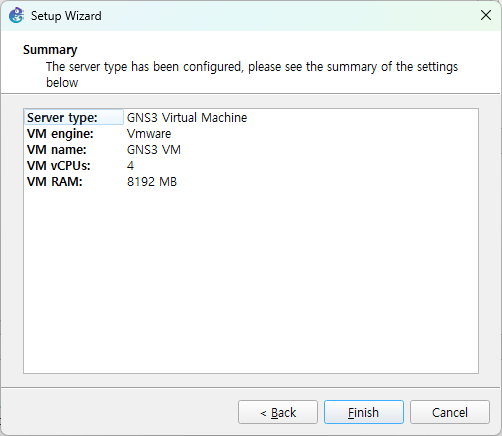 • 다음 단계로 진행하면 GNS3 VM 이 자동으로 부팅된다. Summary 에서 Finish 클릭