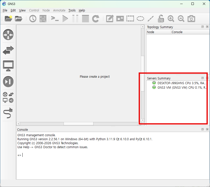 • GNS3 설치가 완료되면 자동으로 GNS3 프로그램이 시작된다.