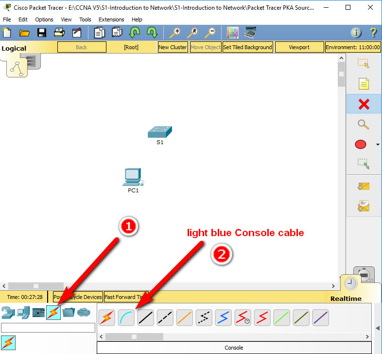 Step 1: 콘솔 케이블로 PC1을 S1에 연결하기