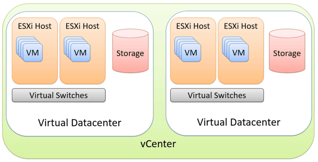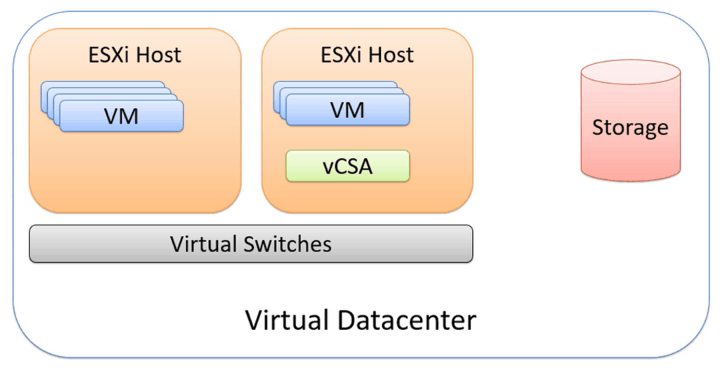 다이어그램을 보시면, 가상 데이터 센터 내에 ESXi 호스트들과 가상 스위치, 데이터스토어가 있습니다. 그리고 vCenter Server Appliance(VCSA) 또한 하나의 가상 머신으로 존재합니다.